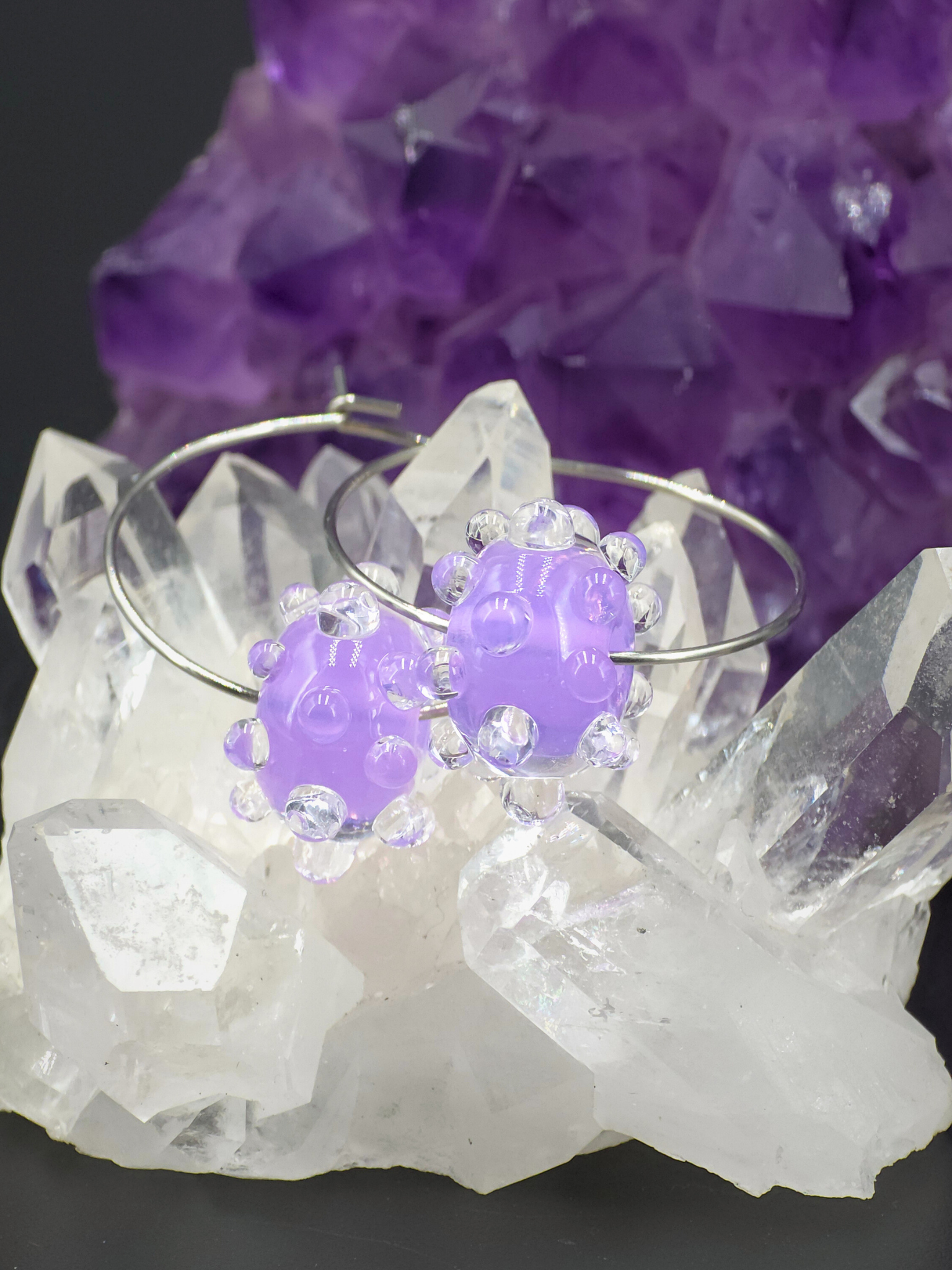 Boucles d'oreilles en verre sodocalcique filé au chalumeau par mes soins dans mon atelier.