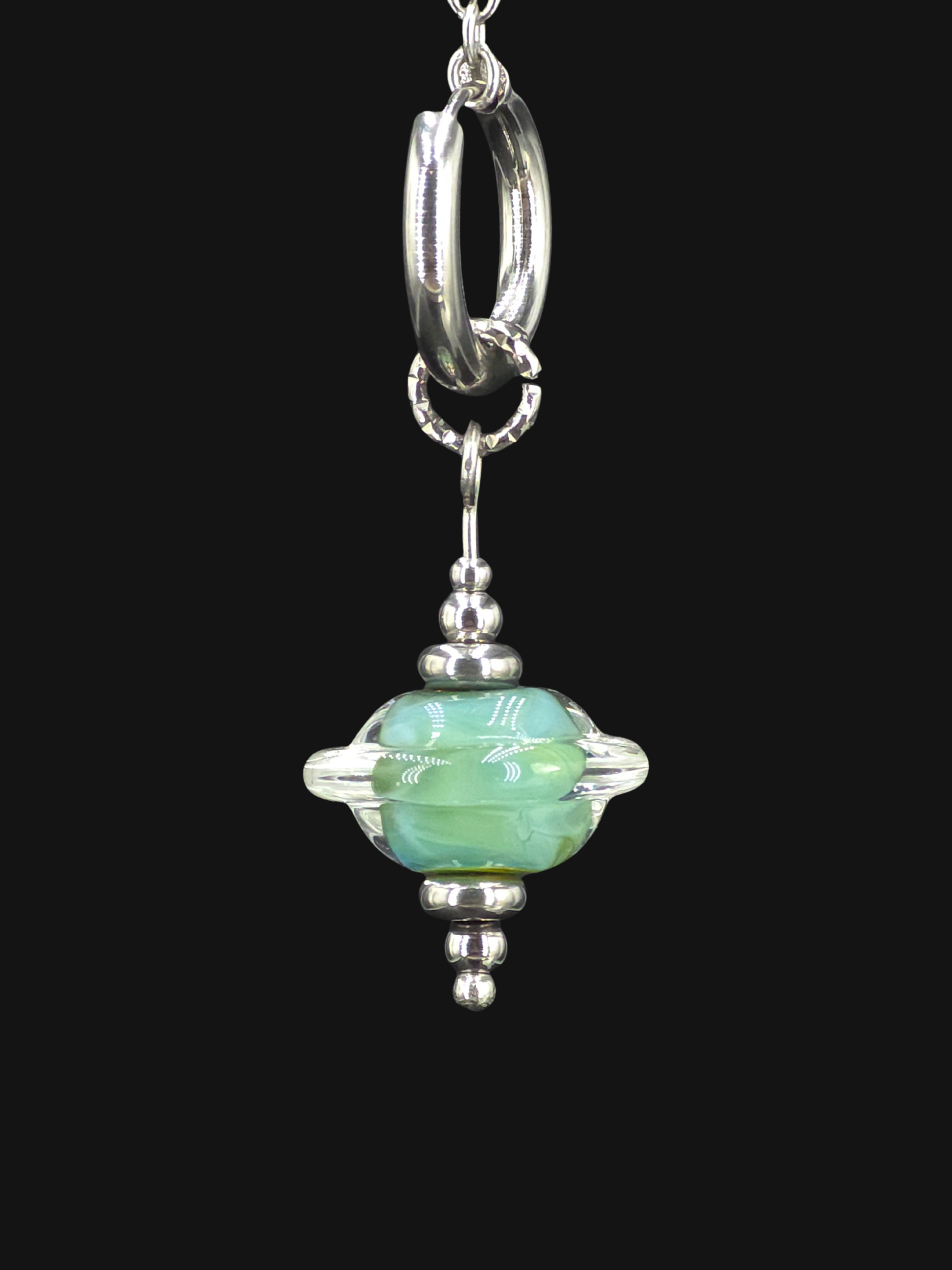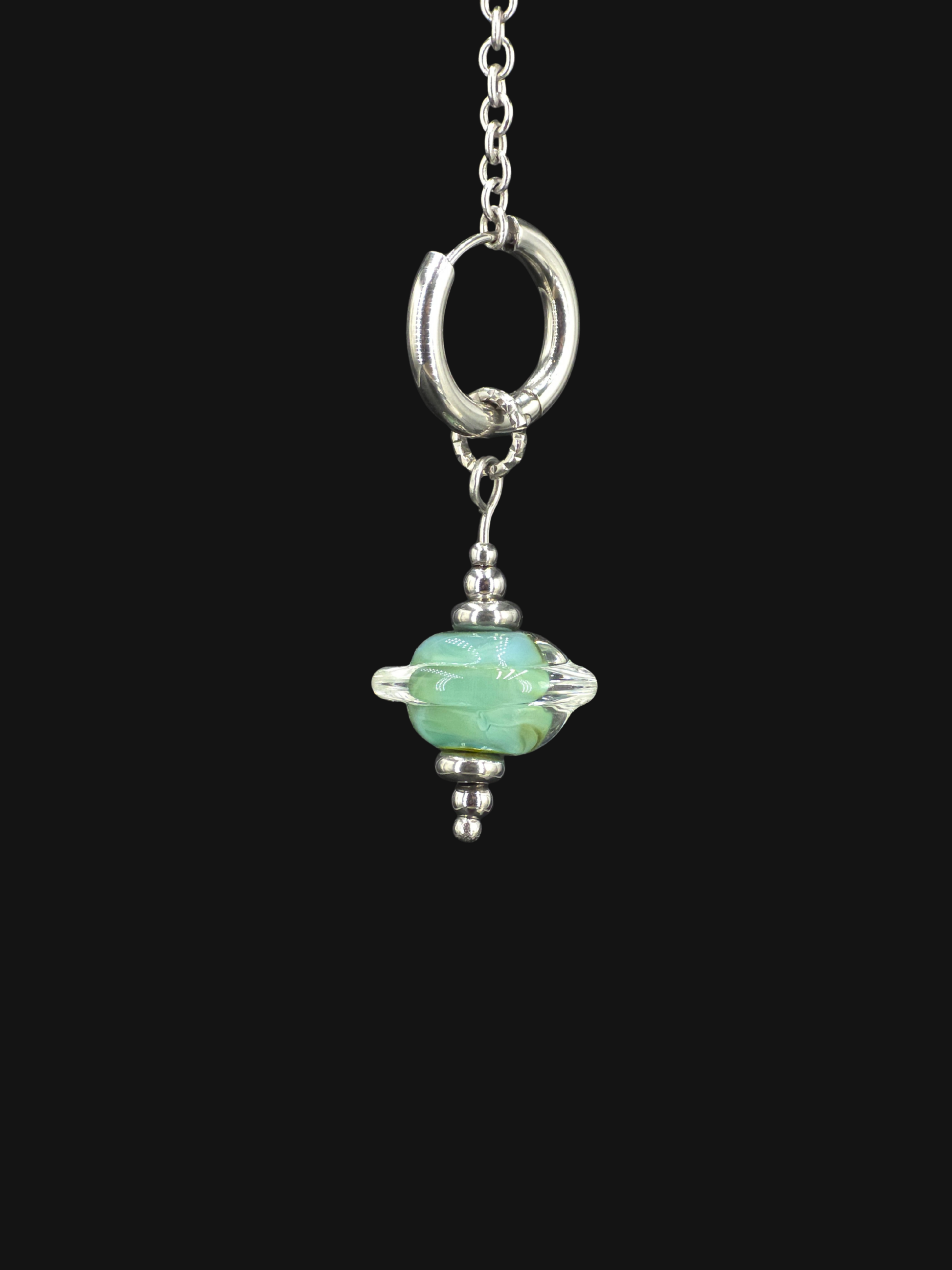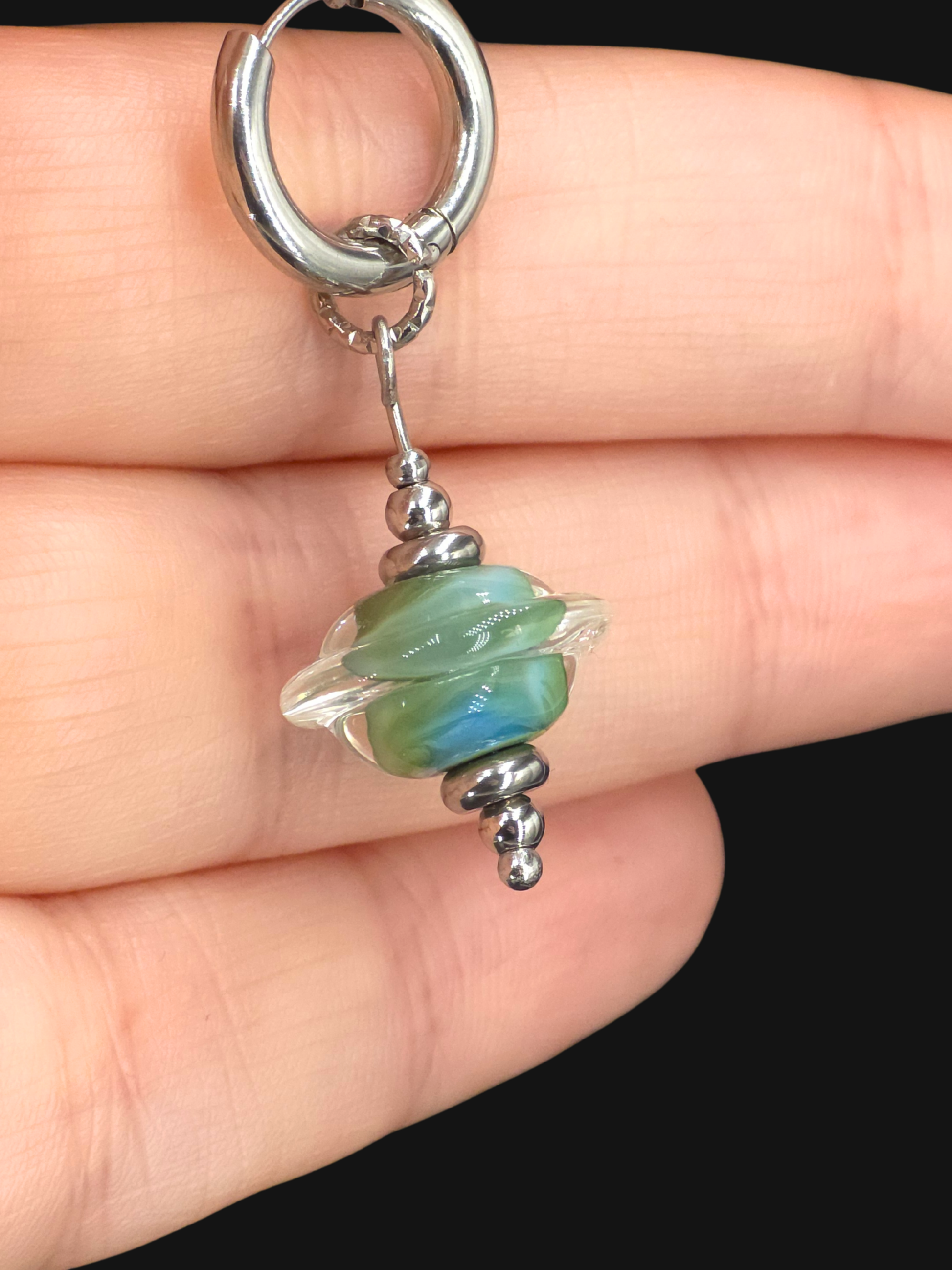 Boucle d'oreille en verre sodocalcique à l'argent filé au chalumeau par mes soins dans mon atelier.