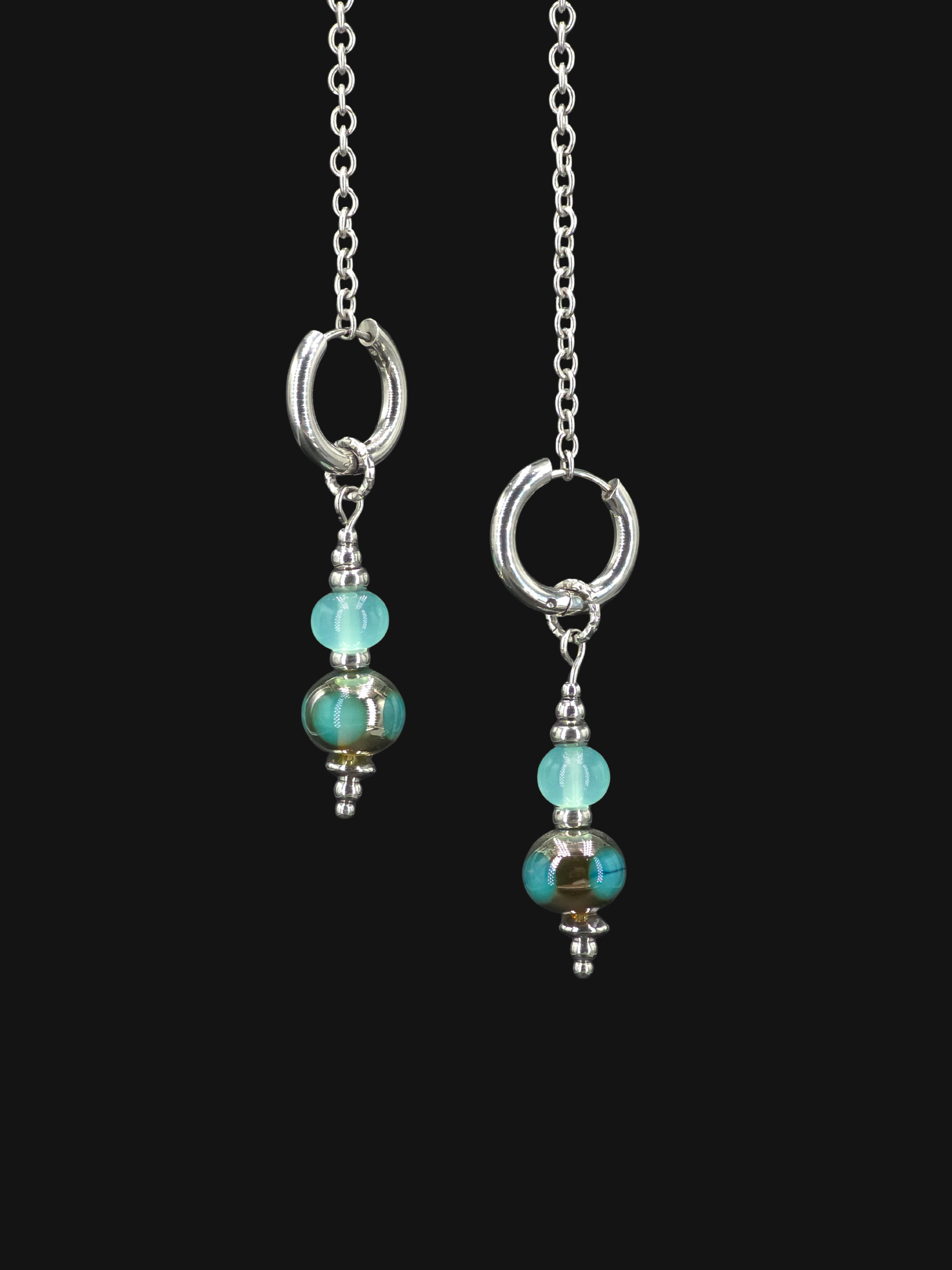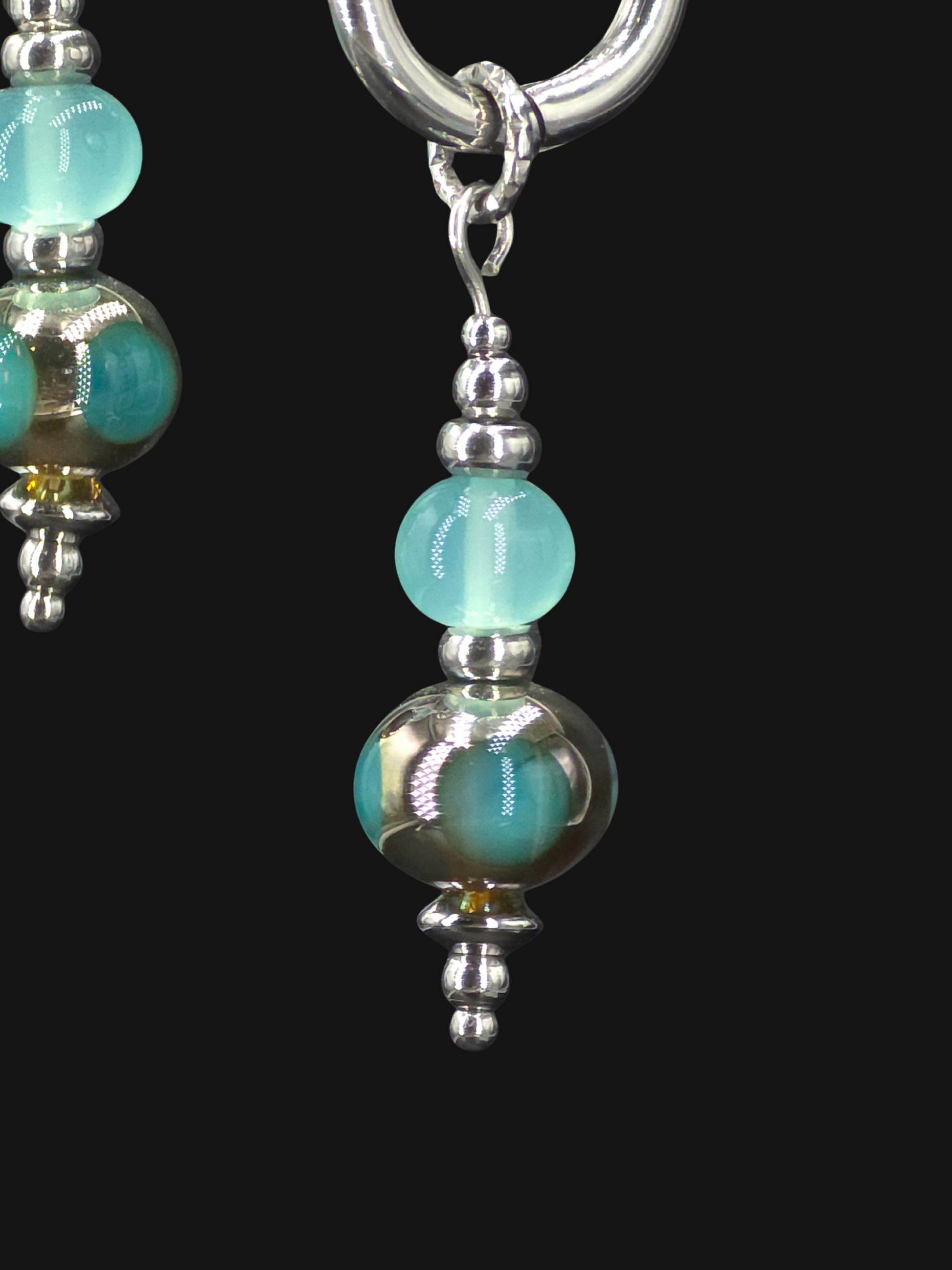 Boucles d'oreilles en verre sodocalcique à l'argent filé au chalumeau par mes soins dans mon atelier.